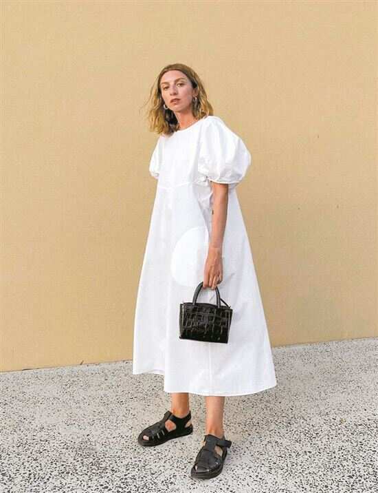 ▲中性而复古的渔夫凉鞋配泡泡袖、娃娃装这样繁复兼带有膨胀感的单品,正好能起到平衡作用,渔夫凉鞋的厚重刚好压住,不至于让造型显得头重脚轻。 |