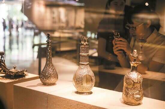 ■银錾刻镂空花卉龙纹套玻璃四口酒瓶等展品让观众流连忘返。 |