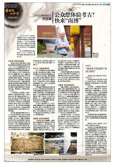 南越王博物院院长 李民涌 2021年9月8日,南越王博物院正式成立,由西汉南越王博物馆和南越王宫博物馆合并组建。3.7万平方米的建筑面积,展示了南越文王墓、南越宫苑、南汉王宫等遗址,将岭南