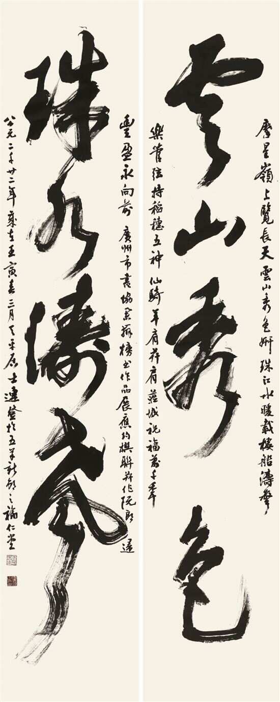 ■连登《云山秀色;珠水涛声》,对联旁一首调寄阮郎归《云山珠水》:摩星岭上览长天,云山秀色妍。珠江水暖载楼船,涛声乐管弦。持稻穗,五神仙,骑羊肩并肩。蒞城祝福万千年,丰盈永向前。题云山珠水,调寄阮郎归。 |