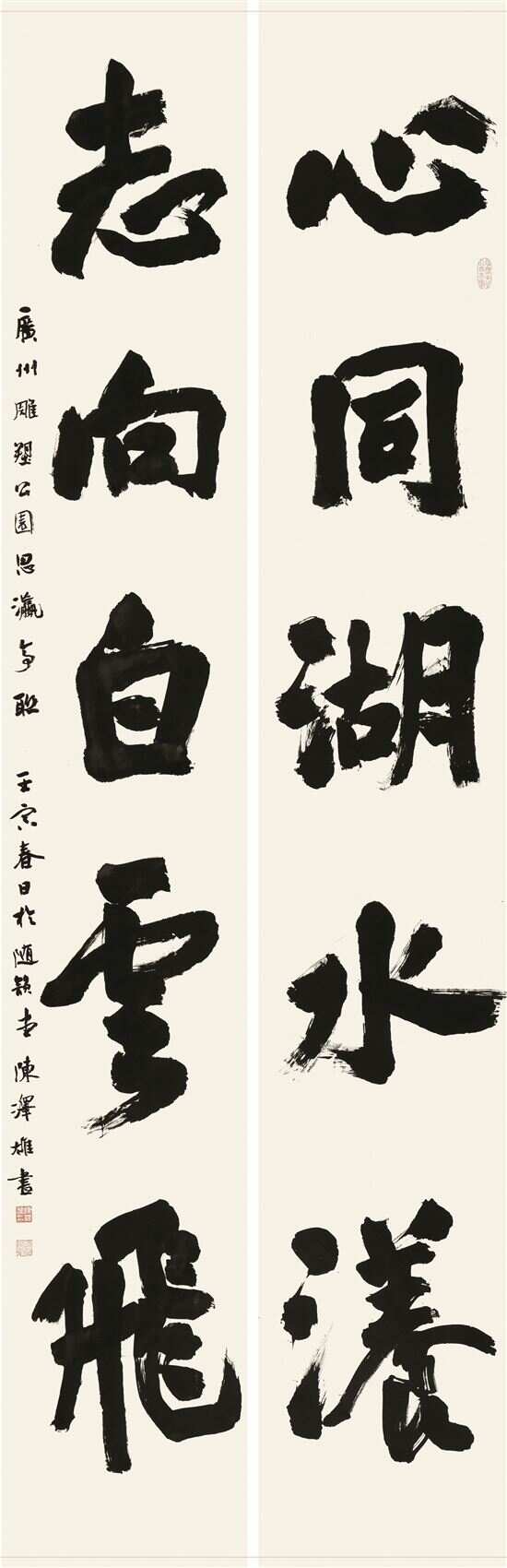 ■陈泽雄《广州雕塑公园思瀛亭联》 释文:心同湖水漾;志向白云飞。 |