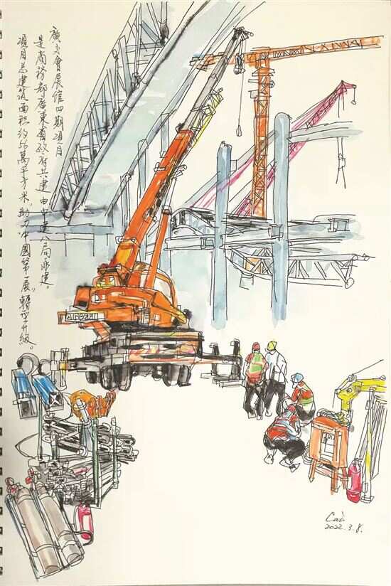 ■蔡施能(画家) 广东地处热带、亚热带,气候温和,雨量充沛,土壤肥沃霜冻少,适合甘蔗生长。早在1300多年前,广东先民就开始蔗糖生产,1995年全省糖产量达226万吨,居全国首位。位于广州琶洲塔下的广东省糖业机械制造厂,于1965年由广东省糖业安装公司组建,主要从事制糖机械制造和设备安装。当年该厂也承担我援非部分制糖装备制造,我到该厂联系工作之余画了厂区速写,一晃40多年过去了。 2002年,这里建设中国出口商品交易会。随着中国出口商品不断增长,广交会展馆也不断地扩建。目前在建第四期项目将于第132届广交会(即2022年秋交会)投入使用,建成后的广交会展馆,展览总面积达62万平方米,将成为全球最大的会展综合体。本工程是广交会四期展馆扩建、28号地铁线和珠江隧道三体共建综合项目,土建和钢构交叉施工,宏伟壮观。该工程的建设,将直接助力粤港澳大湾区发展,形成全球国际会展中心新标杆。 今年“3·8妇女节”随广州市文学艺术联合会的“深入生活 扎根人民”旗帜走进广交会四期工地采风,以速写印证时代的变迁。