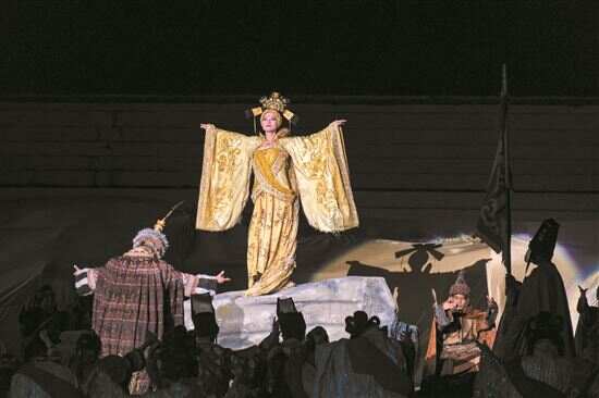 据新华社电 5月26日,大型实景史诗剧《文成公主》在西藏拉萨市举行第10个演出季的首演。 藏文化大型实景剧《文成公主》于2013年首演。该剧以拉萨自然山水为背景,讲述了1300多年前文成公主与松赞干布和亲的历史故事。全剧分为五幕,时长约90分钟。 《文成公主》全剧有近800名演职人员。除专职演员外,很多藏族农牧民参与演出,有效促进当地群众就业增收。