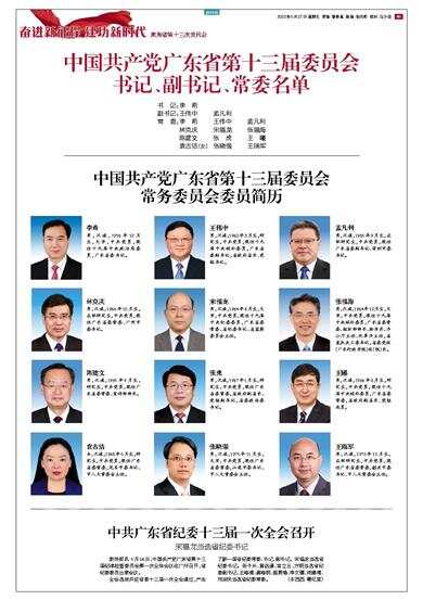 中国共产党广东省第十三届委员会书记、副书记、常委名单