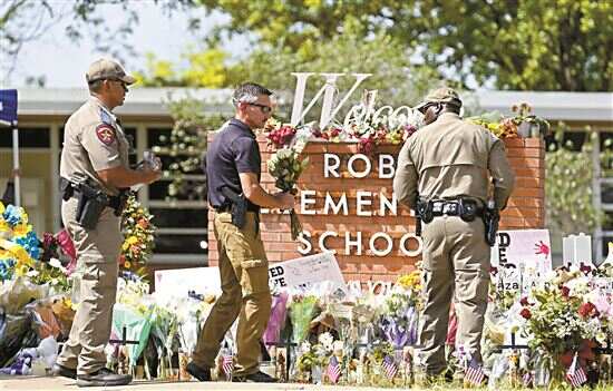 ■5月27日,警察在美国得克萨斯州南部尤瓦尔迪市发生枪击事件的小学外摆放花束。 新华社发 |