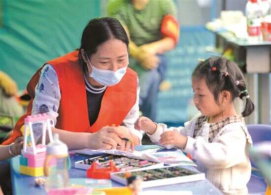■6月2日,在芦山县太平镇太平中学安置点,一名志愿者在教小朋友画画。新华社发 |