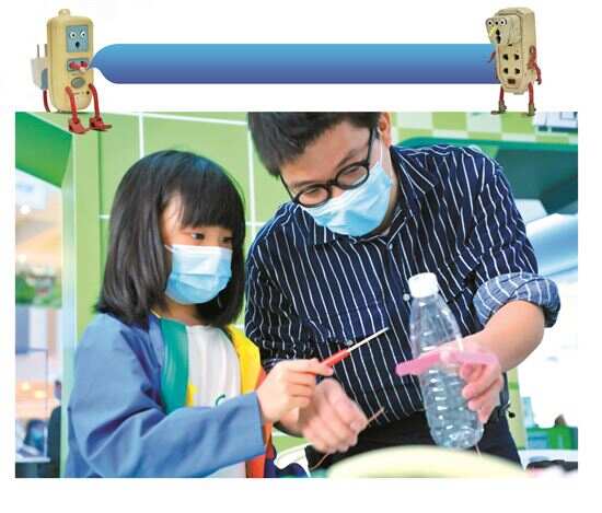 在广州东山口的一个玩具作品展上,小朋友正在尝试将塑料瓶改造成玩具。展览由两名年轻人举办,他们成立了自己的工作室,专门利用废旧物品创作玩具。■新快报记者 李小萌/摄