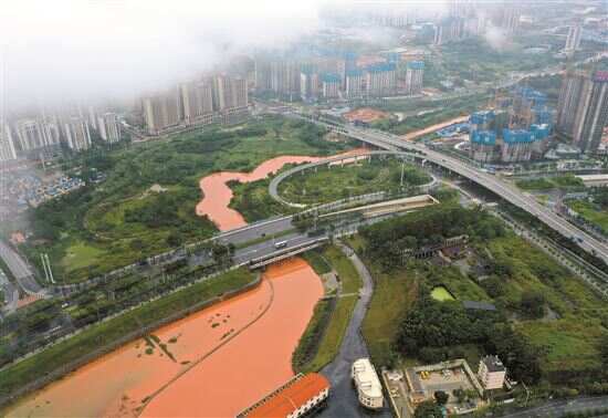 ■6月10日,暴雨过后南宁市良庆大桥南岸一条溪流混入大量泥沙(无人机照片)。新华社发 |