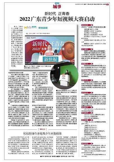 新时代 正青春 昨日,“新时代 正青春”2022广东青少年短视频大赛线上启动仪式在广州举行,17日起面向全省青少年征集原创短视频作品。本届大赛由共青团广东省委员会指导,广东新快报社、中国建