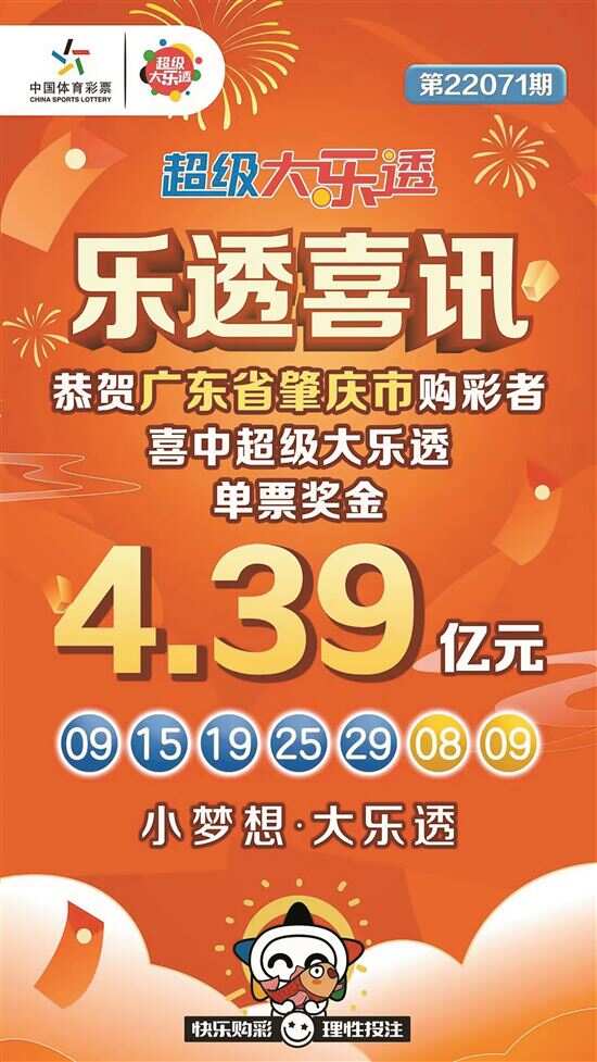 全部花落肇庆一彩票店,两张彩票中奖其中一张中46注 新快报讯 记者陆妍思报道 广东彩票史上第一大奖诞生!6月25日,第22071期超级大乐透开奖,当期广东中出47注954万多元追加一等奖,全部落户肇庆4408008028101体彩实体店,总奖金达到4.48亿元,其中46注由一张彩票独中,单票总奖金4.39亿元。 广东狂中47注追加头奖 第22071期大乐透的中奖号码为:前区“09、15、19、25、29”;后区“08、09”。前区号码大小比3∶2,奇偶比5∶0,连续两期开出全奇组合,“29”遗漏18期开出,开出两组同尾号“09、19、29”及“15、25”;后区开出一组大号连号,分别遗漏2期、1期开出。 本期全国共开出65注一等奖。其中,53注为954万元(含424万余元追加奖金)追加投注一等奖,其中广东中出47注,江苏中出4注、黑龙江、辽宁各中出1注;12注为530万余元基本投注一等奖,分落江苏中出4注,贵州、安徽各中出3注,浙江、云南各中出1注。 两张彩票时间仅距1分钟 数据显示,广东中出的47注追加一等奖全部出自肇庆柑园北路17栋102号的4408008028101体彩实体店,总奖金达4.48亿多元。中奖彩票分两张,一张为46倍投的、1注号码、138元投入的单式追加倍投票,单票擒奖4.39亿元;另一张中奖彩票为5注号码、15元投入的单式追加票,单票擒奖954万元。两张彩票出票时间分别为6月25日10:01:33,6月25日10:00:22,仅距一分多钟,极可能出自一位购彩者手笔,若猜测属实,那么该位中奖者将独揽4.48亿多元巨奖。 全国60个亿元奖中排第五 这个4.39亿元大奖是超级大乐透今年爆出的第二个亿元大奖,也是历史上中出的第22个亿元大奖,排名第2位,仅次于2014年在山东中出的4.97亿元。 这也是广东彩票史上第一大奖。迄今为止,全国福利彩票、体育彩票共中出60个亿元巨奖,其中9个出自广东。4.39亿排名高达全国第五,广东第一,仅次于双色球北京5.7亿元、双色球浙江5.65亿元、双色球山西5.25亿元、大乐透山东4.97亿元。 头奖奖池尚余7.22亿元 同期二等奖开出348注,每注奖金3.22万余元;其中125注采用追加投注,每注多得奖金2.57万余元。追加后,二等奖单注总奖金5.8万余元。 当期全国销量为3.06亿元,为国家筹集彩票公益金1.1亿元。奖池方面,本期开奖结束后,7.22亿元滚存至6月27日(周一)开奖的第22072期。 国内彩市60个亿元大奖 9个出自广东 全国排名 彩种 期号 金额(元) 中出地 5 大乐透 22071期 4.39亿 广东肇庆 22 大乐透 13017期 1.83亿 广东中山 28 双色球 12152期 1.68亿 广东湛江 29 双色球 18055期 1.61亿 广东深圳 38 大乐透 20028期 1.28亿 广东深圳 50 双色球 13025期 1.08亿 广东广州 51 双色球 13033期 1.07亿 广东广州 53 双色球 17093期 1.05亿 广东汕尾 59 七星彩 21066期 1.00亿 广东惠州 ■链接 每注多1元追加,多中1.95亿元 追加投注是大乐透独有的投注方式,是指在2元1注基本投注的基础上,多花1元、一共3元可以构成1注追加投注。采用追加投注方式投注的购彩者,一旦命中大乐透浮动奖奖金,可以在命中基本投注头奖奖金的同时,再“多得”相当于基本投注奖金金额80%的浮动奖奖金——比如,基本投注中奖1000万元,追加投注后就可以总揽1800万元。 在第22071期中,如果肇庆4.39亿元中奖彩票没有追加,那么其只能中出46注530万多元基本投注一等奖,单票总奖金为2.44亿多元。每注少投入1元,到手奖金少1.95亿元!提醒各位购彩者,购买大乐透时切莫忘记追加了。 中奖4.39亿元,缴税8785万元 根据《彩票管理条例》的规定,单注中奖金额超过1万元的,需要缴纳20%的个人所得税,肇庆4.39亿元大奖需全额缴税,税金总额达8785万多元,税后实得奖金3.51亿多元。若4.48亿元为一人独中,则税金总额达8976万多元,税后实得奖金3.59亿多元。 提醒 送1800万元赠票 广东“不中奖也有奖” 火热进行 目前广东体彩“超级大乐透不中奖也有奖”全新升级活动正在开展,将一直持续举行至7月20日的第22082期,赠票总金额高达1800万元。 活动期间,彩民在广东体彩实体店购买超级大乐透彩票,单票单期票面金额符合指定条件且不中奖的,可获得对应金额的赠票。多期票不参与活动。赠票标准如下:单票单期票面金额120元(含)~249元(含),不中奖可获赠票15元;单票单期票面金额250元(含)~499元(含),不中奖可获赠票40元;单票单期票面金额500元及以上,不中奖可获赠票100元。 如果活动资金提前使用完毕,则活动在资金用完的超级大乐透当期销售结束后停止。如果该张彩票中奖但奖金金额低于上述赠票金额,彩民可获得差额部分的赠票。例如,活动期间单票单期购买超级大乐透252元且中得30元奖金的彩民,还可获得10元赠票。