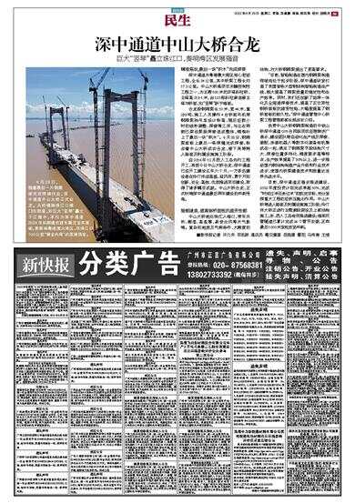 巨大“竖琴”矗立珠江口,奏响湾区发展强音 精准搭设,最后一块“积木”完成焊接 深中通道为粤港澳大湾区核心枢纽工程,全长24公里,其中桥梁工程长约17.2公里。中山大桥是项目关键控制性