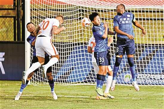 ■梅州客家队球员杜加利奇(左二)头球攻门。新华社发 |