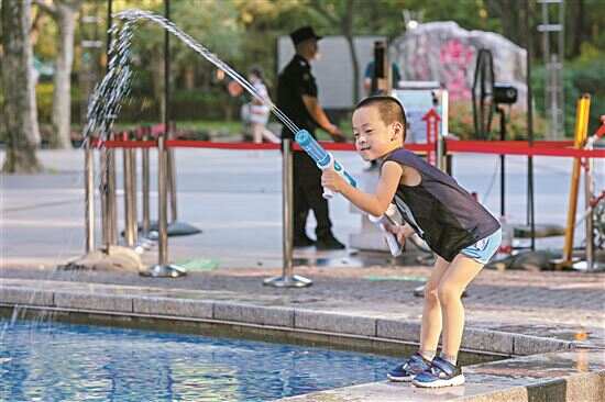 ■7月10日,在上海市徐汇区徐家汇公园门口,小孩在玩水枪。新华社发 |