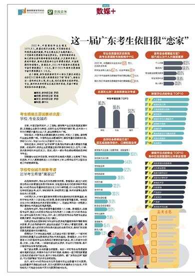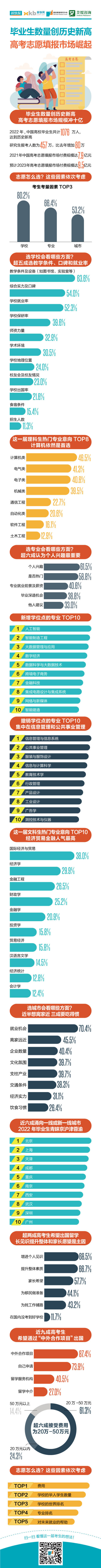 2022年,中国高校毕业生增至1076万人,数量达到历史新高,可是高校招生的难度也越来越高,毕业生就业压力也越来越大,于是高考志愿填报市场应势而生。目前的高考考生缺乏获取全面的高考填报信息渠道,以及高考录取人数逐年增多,高考志愿报考行业付费需求增多,市场规模将持续增长。数据显示,2021年中国高考志愿填报市场付费规模达7.9亿元,预计2023年高考志愿填报市场付费规模达9.5亿元。 这个暑假,新快报数据研究中心联合艾媒咨询推出这份《2022高考志愿大数据报告》(下称“报告”),描绘出这一届的考生怎么想,怎么选,他们在高考后选择学校、专业、城市和未来的职业生涯及海外深造,是基于哪些现有条件和考量因素。 ■策划:新快报记者 罗韵 ■统筹:新快报记者 梁彧 ■采写:新快报记者 罗韵 ■制图:廖木兴 考生填报志愿因素依次是: 学校、专业及城市 目前,中国互联网技术、人工智能、通信等产业正迎来高速发展时期,且随着企业数字化转型,这类行业应用领域不断扩展,在未来4-5年内仍需要大量的从业人员,就业前景较为广阔。 报告显示,中国考生志愿填报最关注学校,未来人工智能、通信等行业就业前景广阔。中国考生在志愿填报时,填报考量的因素依次是:学校(80.2%)、专业(66.4%)以及城市(53.2%)。 报告还显示,学校的“金字招牌”还是考生和家长最为看重的考量因素。在面试时,很多企业更看重应届求职者的学校实力、名气、口碑,其次是学校内专业的实力。因此,很大一部分考生都会精挑细选学校与专业。 而随着社会经济的发展,学校的所在地很大程度上也影响了考生的选择,不少人愿意提前进入心仪的城市上学,以便毕业后可以留在当地工作或继续深造。 学校专业城市都要考虑 近半考生希望“离家近” 在选择学校时,考生会优先考虑教学资源。数据显示,超过六成的受访考生比较看重包括图书馆库存、实验室设备在内的教学条件和设施;54%的考生会考量学校的综合实力与口碑传播;约52%的考生则关注学校的就业率;此外,学校保研率、学校师资力量、学术环境等也是考生会关心的因素。 分析师认为,大学丰富的教学资源为考生提供良好的教育基础,有利于学生未来个人综合能力的发展,是受访者首要考量因素。学校综合实力与口碑是学生未来求职的保障之一。而就业率则在一定程度上预示着学生未来就业的难易程度。 在选择专业时,考生的首要考量因素是个人兴趣。数据显示,在填报专业时,接近62%的受访考生会优先考虑个人兴趣;约59%的考生会关心该专业是否为热门专业;另外,有三到四成的考生会考虑专业就业前景及薪资、毕业深造机会及他人建议。 如果说考生在选择学校与专业时会更多地考量教学条件等教育相关因素,那么在考虑城市时,就业机会就成了大部分人看重的因素。调查结果表明,超七成的受访考生表示就业机会是否充足,是他们决定是否要选某座城市的关键所在。 疫情加大了大学生就业难度,以及就业市场人数增多,一个城市充足的岗位数量及企业数是保证考生未来的基础。数据显示,2022年中国有40.8%的高校毕业生选择自己青睐的城市就业,前三的城市分别是:北京、上海、天津。一线城市就业机会更多,专业对口性较强,是不少高校毕业生首选的就业地。 除了就业前景,生活质量也很重要。有近一半的考生会考虑就读城市离家的远近,毕竟学子在外求学不容易,能够在一座方便回家看望父母亲友的城市学习生活,是不少学生的期待。像广东考生这种“离家近,可以回家喝汤”的诉求也依然坚挺。 此外,有约40%的考生会关注所选城市的企业数量与文化氛围。企业数量多代表就业机会多,而文化氛围则关系着课余文化生活,不同性格的人可能适合在有不同文化氛围的城市生活。