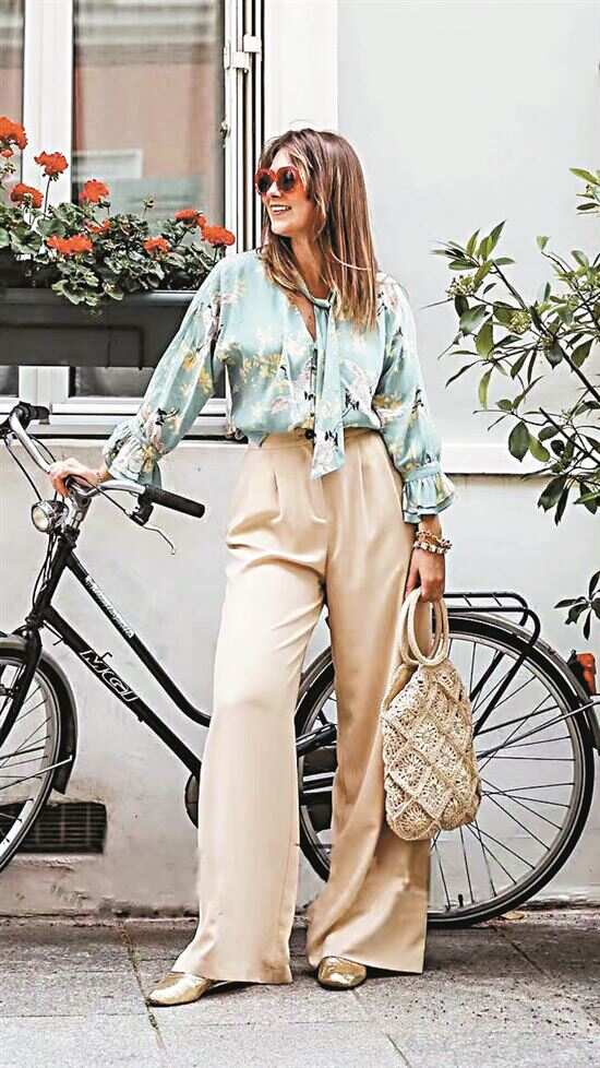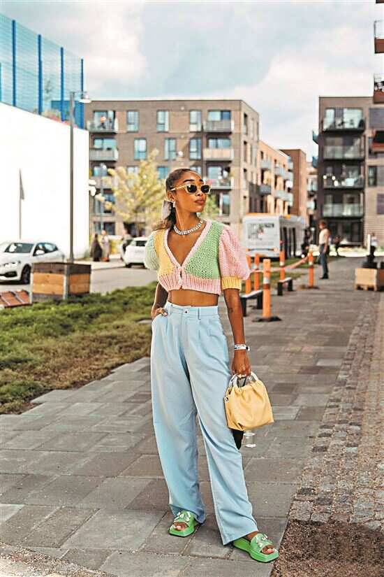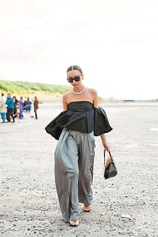 ◀尝试用相对正式且硬挺的单品中和云朵裤的休闲和柔软感,如西装、抹胸元素混搭。 |