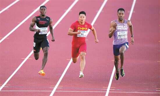 ■7月16日,2022俄勒冈田径世锦赛展开男子百米预赛的争夺,中国选手苏炳添(中)以10秒15的成绩获得小组第五名,并以0.003秒的优势力压对手晋级半决赛。新华社发