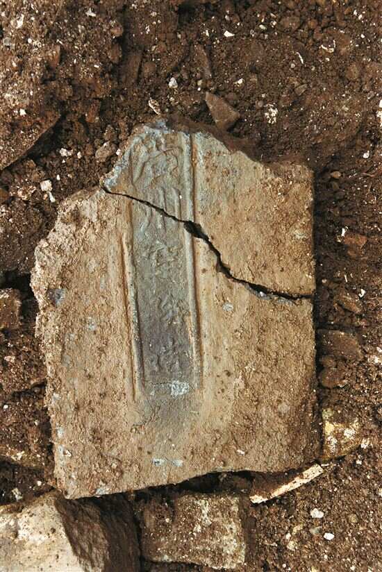 ■2021年8月13日在文头岭窑址采集的“何深郡”印文酱釉陶罐残片 |