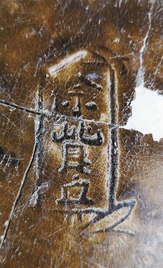 ■南越国宫署遗址出土的宋代奇石窑“徐货皿”印文酱釉四耳大罐和局部 |