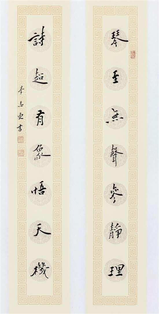 ■李志东,楷书七言对联。释文:琴至无声参静理,诗超有象悟天机。 |