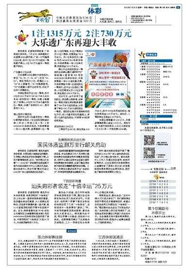 1注1315万元 2注730万元 大乐透广东再迎大丰收