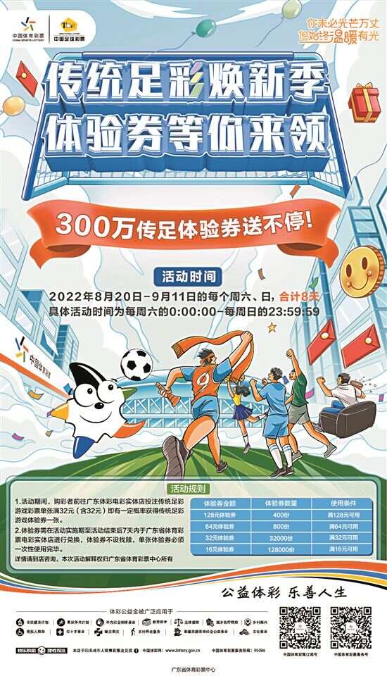 传统足彩焕新送好礼 新快报讯 记者陆妍思 通讯员粤体彩报道 喜欢传统足彩游戏的朋友们,广东体彩送好礼啦!为迎接新赛季的欧洲五大联赛,广东体彩为广大球迷朋友准备了传统足彩游戏体验券大礼,总赠送金额超300万元。 购足彩满32元可参与 根据活动规则 ,2022年8月20日至9月11日期间的每个周六和周日(合计8天,具体活动时间为每周六的00:00至每周日的23:59),彩民朋友只要在广东辖区内体彩实体店购买中国体育彩票传统足彩游戏单票满32元(含32元),即有机会获得传统足彩游戏体验券一张。体验券金额16元至128元不等。 满足活动参与要求且被抽中的彩票票面会打印上体验券的二维码(未抽中不打印二维码)。购彩者获得体验券后,可在广东省内任意体彩实体店进行传统足彩彩票兑换,体验券可兑换等额传统足彩彩票,或用于抵扣高于体验券金额的传统足彩彩票购票款,单张传统足彩彩票只可使用一张体验券,不可兑换现金或其他游戏的彩票。体验券需在活动实施期至活动结束后7天内于广东省体育彩票实体店进行兑付。 销量22%汇入公益金 各路绿茵豪门已经开始新赛季的较量,足球的激情正在神州大地上驰骋。如果您喜欢足球运动,对竞猜足球比赛的赛果感兴趣,那么一定不要错过这次活动! 传统足彩主要包括14场胜负、胜负任选9场、6场半全场胜负和4场进球等游戏,竞猜的赛事包括欧洲五大联赛、世界杯、欧洲杯、美洲杯、亚洲杯等重要赛事。根据足球彩票近期奖期竞猜场次安排来看,用户在获得体验券后,可以第一时间针对欧洲五大联赛的赛事进行竞猜,希望大家享受看球购彩的乐趣,收获中奖的喜悦。 公益体彩,乐善人生。彩民每购买一张足球彩票,就有22%的购彩金汇入体彩公益金,将用于社会公益事业和体育事业的发展。中国体育彩票作为国家公益彩票,筹集的公益金除大量用于社会公益事业外,在健康中国和体育强国建设中也发挥了重要作用。社会足球场地运营保障、青少年足球运动发展等方面,都离不开体彩公益金的强有力支持。