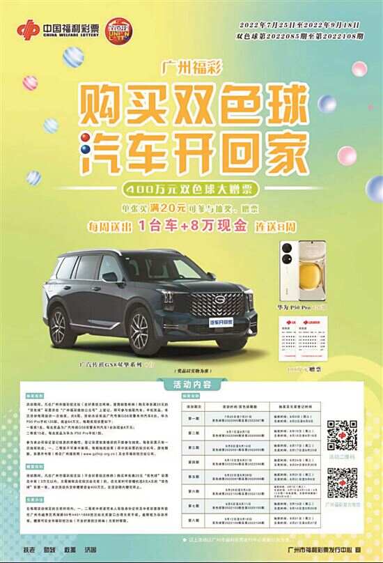 购买双色球,汽车开回家 新快报讯 记者陆妍思 通讯员郭新庆报道 8月17日上午,广州市福彩中心举办第三期“购买双色球,汽车开回家”抽奖仪式,来自南沙区大岗镇的彩民中得当期广汽传祺GS8汽车一辆和8万元现金大奖。 逾32万张票“抢”汽车 据统计,8月8日至8月14日第三期活动期间,广州市共售出满20元双色球彩票492807张,其中登记参与抽奖的有效票数为329991张。本期抽奖活动的一、二等奖将在这32万多张彩票中产生。 抽奖仪式现场,市福彩中心工作人员将广东省福彩中心提供的数据光盘从密封好的信封中取出,放入专用的抽奖电脑并将抽奖数据导出至抽奖软件中,随后激动人心的抽奖环节正式启动。经过多轮抽取,第三期抽奖活动的15个二等奖和1个一等奖先后“出炉”。位于南沙区大岗镇豪岗大道2-12号44011504站成为本期活动的最大赢家,该站彩民幸运中得广汽传祺GS8汽车一辆和8万元现金大奖。 须在8月23日前办理兑奖 根据活动安排,第三期中奖者须在8月23日前的工作日内,凭中奖彩票原件及本人有效身份证件到越秀区西湖路99号1楼44011888投注站办公窗户办理兑奖手续,逾期未办理者将视为自动弃奖。 为避免发生弃奖,市福彩中心还推出贴心服务,每期抽奖结果出炉后安排专人通过电话或短信、微信推送的方式将中奖喜讯传达给中奖者。本期抽中汽车的幸运儿在接到工作人员的电话通知后表现得十分淡定,只是淡淡地回复说“知道了,我会尽快去兑奖”。相比之下,中奖站点里却是另一番景象:44011504站点负责人冯先生表示,站点中午开门营业后,来了不少前来沾喜气、打听消息的彩民。他说:“相信中了汽车大奖后,愿意参与活动的彩民会越来越多,也希望接下来大奖、小奖都会继续来到我们站里。” 相关 下周三将送出第四台车 据了解,为真情回馈彩民,广州市福彩中心连续第九年重磅推出“购买双色球,汽车开回家”大型营销宣传活动,7月25日至9月18日期间,凡在广州市福彩投注站(含便携销售终端)购买单张满20元的双色球彩票,扫描活动二维码并通过“广州福彩”微信平台登记,即可参与汽车加现金抽奖。活动共开展8周,每周都会送出1台广汽传祺GS8汽车加8万元现金、15台华为P50 Pro手机。活动还首次配套开展了400万元双色球大赠票活动,彩票满20元且中奖即有机会获赠8元4注的机选双色球彩票一张。 目前“购买双色球,汽车开回家”第四期正在火热进行中,彩票有效抽奖范围为2022年8月15日至8月21日(双色球第2022094期至第2022096期),购买符合条件的彩票并于8月21日晚24时前登记即可参加抽奖。第四期抽奖仪式将在8月24日进行,彩民朋友仍可把握好机会,参与“汽车+现金”大奖的角逐。广州福彩提醒广大彩民,在微信登记时,一定要仔细核对登记彩票信息,避免出错,切莫让宝贵的抽奖机会从指间溜走。