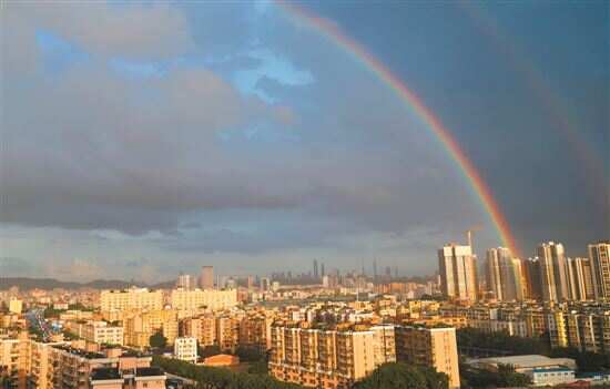 昨日,台风“马鞍”已经离境,受其外围环流和热对流影响,傍晚时分的广州出现一道绚丽的彩虹。