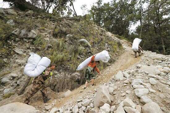 据新华社电 9月8日,在四川省甘孜州泸定县磨西镇附近,救援人员沿着被地震损坏的小路运送救灾帐篷。 四川泸定地震发生后,震中磨西镇附近一些居住在山上的村民,因道路损毁未能全部撤出,只能在相对安全的开阔地带搭建临时安置帐篷。救援人员和志愿者沿着临时架设的过河小桥和开辟出的上山小路,通过肩背人扛,把饮用水、帐篷等物资送上山,为山上临时安置居民建立了一条供给线。 记者从8日晚在雅安市石棉县召开的四川省“9·5”泸定地震抗震救灾省市(州)县前线联合指挥部新闻发布会上获悉,截至8日12时,四川泸定地震已经造成86人遇难,其中甘孜州50人遇难、雅安市36人遇难,另有35人失联。