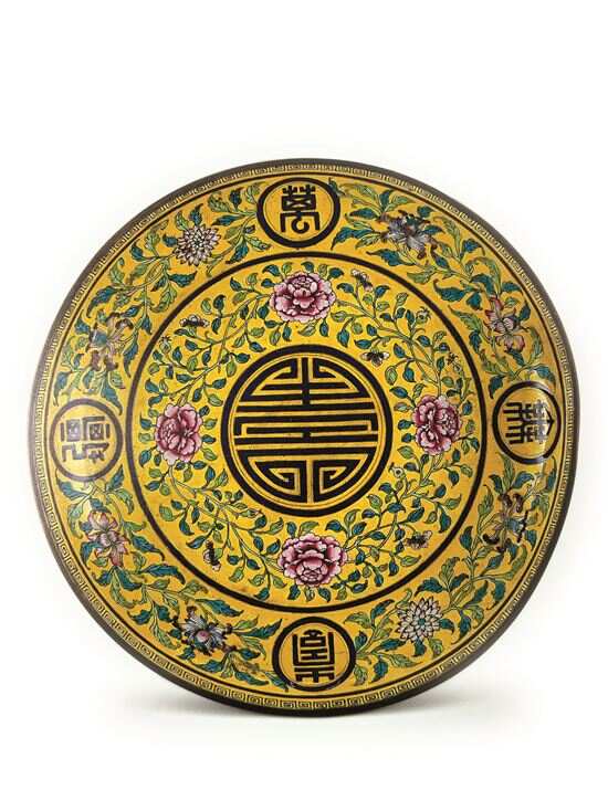 ■铜胎画珐琅“万寿无疆”缠枝花卉纹盘,清乾隆时期。图片来自《广东省博物馆藏品大系 杂项卷一》,文物出版社,2020年12月第1版。 |