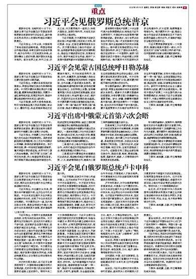 据新华社电 当地时间15日下午,国家主席习近平在撒马尔罕国宾馆同俄罗斯总统普京、蒙古国总统呼日勒苏赫举行中俄蒙三国元首第六次会晤。 习近平指出,中俄蒙三方合作具有强大的内生动力和发展韧性。