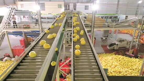 ■梅县金柚产业园内,工人们借助机器分拣柚子。 |