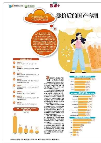产销量增长乏力 中高端产品频现 曾经,在大排档,一碟花生再喝一口冰啤酒,是亲民消费的代表,不同收入水平的人都能享受到的快乐。然而,近年来,这种传统印象发生了变化——随着居民消费水平提高,人口结构的老龄化、消费新力量Z世代的喜好改变、养生健康观念的发展和露营宅家等饮用新场景的增加,中国啤酒的总销量出现拐点,人均消费量逐年递减,产品纷纷走上高端化、品质化的路线。有意思的是,众多数据证明,啤酒的价格一路高涨,而定位中高端的啤酒反而变得越来越受欢迎。 ■策划:新快报记者 罗韵 ■统筹:新快报记者 梁彧 ■采写:新快报记者 罗韵 ■制图:廖木兴 01 啤酒巨头推高端产品 销量一般,吸睛作用满满 啤酒是继水和茶之后的世界第三大饮料,19世纪末啤酒由欧洲传入中国。从去年开始,几款价格高得“离谱”的啤酒产品让许多人震惊,一下子将啤酒的单价从几块钱提升至上千元。 2021年,华润雪花啤酒重磅推出高端啤酒产品“醴”,官方售价999元/盒(2瓶/盒,999ml/瓶),每年限产40000组。2022年1月9日,青岛啤酒上线自家的超高端新品“一世传奇”,官网定价1399元/瓶(1.5L)。百威啤酒也紧接着在春节期间推出一款名为“大师传奇”的虎年限量版高端啤酒,售价高达1588元/瓶(798ml),限量发售2400瓶。 对此,中国酒业协会秘书长兼啤酒分会理事长何勇表示:“2021年是啤酒业高端化元年,是走出底部的标志性年份,是真正的价值回归时代,量价齐升。”同时该协会提供的数据表明,国内人均啤酒消费量于2013年达到最高值37.2升后,其逐年递减趋势明显。 但是,消费者是否买账还是未知数。据天猫旗舰店9月25日的销售数据显示,“醴”虽然每年限产4万组,但月销售数据仅为100+;青岛啤酒“一世传奇”的月销量为7。 有分析师表示,啤酒巨头纷纷推出这些千元啤酒,其象征意义大于市场意义,更多是为了争夺品牌制高点,为后续的高端化带来帮助。千元啤酒真正的意义不在于啤酒花、麦芽度、泉水,而是让别人有话题感,能上热搜,说白了就是一个营销方案。