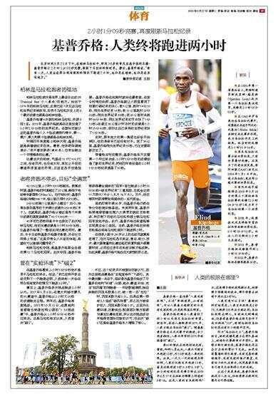 2小时1分09秒完赛,再度刷新马拉松纪录 北京时间9月25日下午,在柏林马拉松中,即将38岁的肯尼亚选手埃利乌德·基普乔格以2小时1分09秒完赛,刷新了马拉松的新纪录。赛后,基普乔格说:“