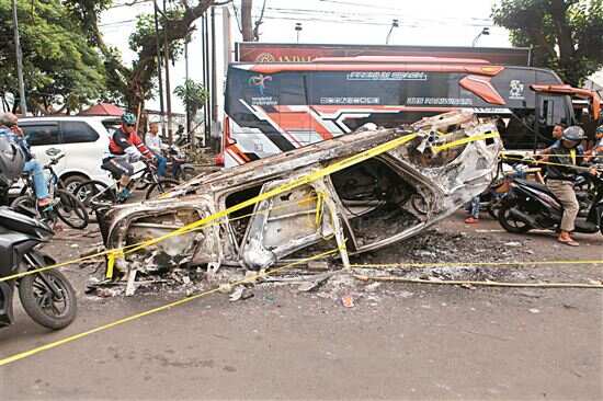 ■10月2日在印度尼西亚东爪哇省玛琅市事发球场外拍摄的被焚毁的车辆。新华社发 |