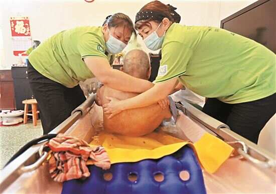 ——“助浴师”职业兴起 忙碌了一天回家洗个热水澡,这件在日常生活中再简单不过的事,却是一些老人望而却步的难事。有些家庭的浴室湿滑、闷热,给老人们带来诸多不便。尤其对失能老人来说,洗澡几乎成了不可能的事情。在这一背景下,助浴服务应运而生,也催生着一个新职业——助浴师。 “老人性格比较害羞,第一次助浴会有点紧张,慢慢就适应下来。虽然他表达不出来,但洗完后阿姨也说他睡得比较舒服。”今年八十七岁高龄的黄爷爷已是第三次接受上门助浴服务了。据其女儿黄女士介绍,之前曾为帮父亲洗澡一事犯过愁,“老人块头比较大,请来的阿姨很难将他挪去浴室,只能用毛巾擦身体代替,所以清洁也不会那么全面彻底。” 2019年,黄爷爷痛风发作后,日常出行都依赖轮椅,加之他所居住的居民楼里没有安装电梯,下楼走动的机会就更少了。也因为没有安装电梯,也苦了提供助浴服务的广州市越秀区福寿康养老服务中心助浴团队,每次上门助浴她们都要扛着浴缸和洗浴用具爬上六楼。 将洗浴用具搬到服务对象的家中仅仅是个开始,洗浴前,先由护士评估老年人身体状况,助浴师协力将老人抬至可移动的浴缸内,并将老人调整至较为舒适的角度,细心为老人耳朵塞进棉花球,专用毛巾覆盖在老人身上保护隐私,护士全程监控老人健康状况,两到三位助浴师相互配合清洗全身、擦干身体、吹干头发……洗浴时间只有20分钟,但前前后后加起来可长达2个小时。 今年6月,广州市第九届公益创投项目最终确定资助141个创投项目,其中为老服务类占44个,广州市越秀区福寿康养老服务中心的“浴”你一起 “澡”福万家——特殊失能老人上门助浴计划项目就是其中之一。据机构负责人介绍,该公益项目获得了8万元人民币的资助,服务对象主要是特殊失能老人,预计今年内将为广州户籍100位老人、共300人次提供免费上门助浴服务。 现年96岁的钟爷爷也是该项目的服务对象之一,他卧床已有五年时间,平时由子女们照顾,当钟爷爷的儿子得知有这么一项公益服务之后,鼓励父亲去尝试,“一开始我们就怕父亲不太适应,还给他做思想工作。尝试过后跟父亲交流,他好像比较接受这种方式。” 助浴师王玉荣今年7月份开始接触该行业,一趟服务下来她早已满头大汗,她表示,身体上的劳累不难克服,更难的是克服心理障碍。“但想一想我们也有老的一天,其实心理障碍也不算问题。” 助浴行业也有隐忧,据该机构负责人表示,其实助浴服务在老年人群体当中接受程度并不高。目前项目通过政府资助走公益路线提供免费服务,如果走市场化路线就“前路艰难”,还有传统观念、人力成本等等诸多问题要解决。 数据显示,2012年-2021年,广州市户籍60岁及以上老年人口规模从126.43万人增至185.7万人。广州市居民人均预期寿命从2012年的79.41岁提高到2021年的83.18岁。据广州市社会科学院发布的《广州蓝皮书:广州社会发展报告(2022)》:对比国际标准来看,广州户籍人口已接近中度老龄化阶段。 在老年群体中,失能、半失能老人照护需求程度较高,作为养老服务行业的一个细分领域,助浴师的出现或许会为老年人带来更多选择,也为就业带来新方向。 ■图片:新快报记者 郗慧晶 ■文字:新快报记者 麦婉诗
