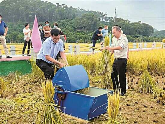 新快报讯 不久前,黄江镇黄牛埔湿地公园里的47亩晚造水稻悄然走红,成为“网红”打卡点,不少市民甚至带上帐篷、野餐垫、折叠椅,在稻田边露营,感受金秋的气息。11月14日,在黄江镇黄牛埔湿地公园,47亩晚造水稻经过几个月的精心栽培,终于迎来了丰收。 在黄江镇2022年水稻晚造收割活动现场,农户们抢抓晴好天气忙收割,田间地头一派繁忙景象。 黄江镇农林水务局局长陈锦全介绍,黄牛埔湿地公园水稻分早造和晚造两季种植,今年第二季水稻已进入收割期,亩产值达800斤左右,水稻将经过收割、贮存等流程,确保颗粒归仓。 “我们还邀请了周边的村干部、代表,走进田间地头体验收割,宣传粮食安全,让市民群众更加珍惜粮食。”陈锦全说。 陈锦全介绍,根据国家相关部署,近年来黄江镇水稻种植面积正逐步回升。根据田间测算,黄牛埔湿地公园水稻面穗数较足,整体长势良好。黄澄澄的稻田里,沉甸甸的稻穗挂满了稻秆,参加收割活动的人们脸上不禁露出丰收的喜悦。(田晓霞)