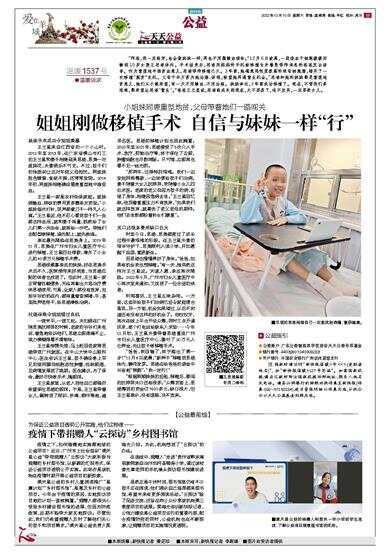 小姐妹同患重型地贫,父母带着她们一路闯关 温暖1537号 ●温暖诉求 “阿爸,我一定能好,也会像妹妹一样,再也不用靠输血续命。”12月6日凌晨,一袋造血干细胞缓缓回输到10岁女
