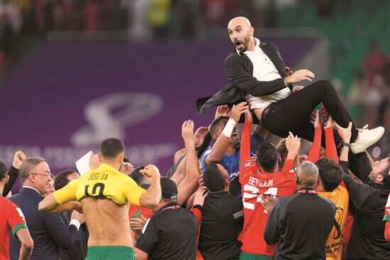 ■摩洛哥队成员在比赛后抛起主教练瓦利德·雷格拉吉庆祝。新华社发 |