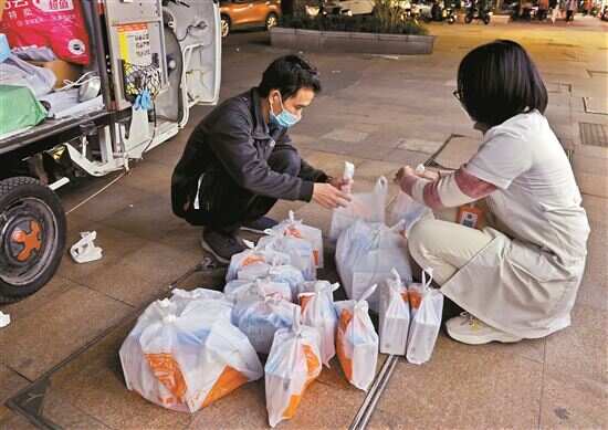 ■在广州天河区一社区药房,员工将打包好的药品给快递小哥,为不便出门的街坊送上门。12月以来,药店与顾客、街坊之间互帮互助,尽量让大家都能获得急需药。新快报记者 李小萌/摄