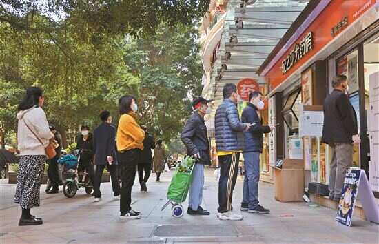 ■12月22日一早,新冠抗原检测试剂盒到货了,市民来到药店有序排队购买。 |