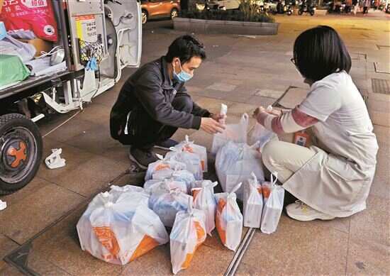 ■晚上,员工将打包好的药品给快递小哥,为不便出门的市民送药上门。 |