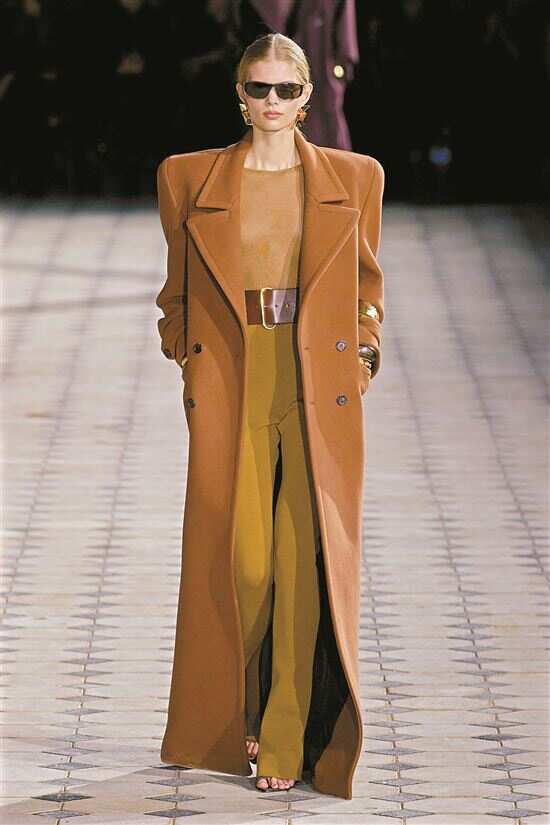 ◀Saint Laurent在轻盈飘逸的裙裤套装外搭配了带有挺括肩型的大衣,配搭木质或金属材质的配饰,流露出锋利性感、温柔量感的形格特质。 |