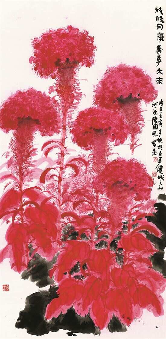 ■收藏周刊记者 梁志钦 日前,2022年源城区“满堂红”系列书画作品展在河源开幕。据介绍,“满堂红”系列书画作品展共展出94幅作品,由陈国锋(笔名:陈国风)创作,均取材于鸡冠花。画家陈国锋表示,功成名就大器晚成者之风采犹如鸡冠花至美之境,它自强不息,脚踏实地,雍容大度,厚积薄发! 喜好画满堂红题材并不断地探索出独特的画法 陈国锋自幼喜好书画,有缘得到李文辉启蒙学习书法,远追秦汉,近学明清。后有幸得到卢延光、李醒韬二位前辈悉心指导;他的山水画取法于宋元经典和明清诸家,以书入画,讲意趣、重格调。写意花鸟画则喜于近现代名家。喜好画满堂红题材并不断地探索出独特的画法,逐渐形成个人的绘画特色。 日前,由中共源城区委宣传部、源城区文化广电旅游体育局、源城区文学艺术界联合会联合举办的“奋进新征程·建功新时代”2022年源城区“满堂红”系列书画作品展在河源开幕,展出陈国锋取材于鸡冠花的“满堂红”系列作品94幅。 陈国锋表示,“鸡冠花不像牡丹花,有艳丽动人的花瓣;也不像兰花,有幽寂隐逸的芬芳;也不像桃花,有红艳争春的媚态!它毛茸茸的花冠沉甸甸的,仿佛一位敦厚工稳而富有格调又别具风情的大器晚成者!” “绛色真如妃醉酒,芬芳浓艳胜诸花” 绘画贵在平凡之处现大美,能够从通俗不起眼处体味高尚品格,既是对生活的歌颂,也是托物言志的最好体现。画家陈国锋一系列的鸡冠花在这方面着实让人欣喜。在百花之中,鸡冠花远不算华贵,它甚至连名字都那么平凡,也不像牡丹、杜鹃、百合等来得清雅,它不过是因为形似大公鸡头上的雄冠而得名。因此,在百花林里,鸡冠花注定是低调、含蓄的一类。但如同“俏不争春”的梅花一样,在鸡冠花的生命中,却绽放着不一样的色彩。 鸡冠花多生长在庭前院后,檐下砌边,对环境没有太多的要求,随地生根,随遇而安。不时有鸡鸭啄食其叶,有蚜虫蚕食其芽,有行人脚踩其根,使其伤痕累累,样子显得有几分老成与沧桑。但恰恰因为历经了种种磨练,它才得以更坚强更茁壮地成长,因而绽放出别样的美,成就了与众不同的大器晚成者之品格这一点,陈国锋感悟尤深,在他笔下,鸡冠花富丽而不娇媚,雍容而不庸俗,花冠雍容大度,富丽含蓄而不招摇。既热情奔放又不失沉稳大气。 在陈国锋的鸡冠花系列中,他大胆运用了紫红色,以定格花卉本身的艳丽,紫红色在中国画创作里,是一种不好驾驭的颜色,它的视觉张力远大于其他色彩,但勇于探索、但求突破的陈国锋愿意一试,用憨拙的用笔巧妙地降低了紫红本身的艳俗,正如明代徐渭所言“不求形似求生韵”,在陈国锋看来则是,“绛色真如妃醉酒,芬芳浓艳胜诸花。” 特别注意“以书入画”“书画并举” 虽然唐代王维曾言“水墨最为上”成为了后世对水墨单色追求的“铁律”,对“随类赋彩”的选择有点高低之见,但在颜色的把握上,再融合“骨法用笔”,也不能否认可创作出高雅清新之作。 南朝谢赫“六法”中的“骨法用笔”是线条在中国画运用中,较早内化成了中国画在骨力追求上的理论指导,在具体的实践上,宋末元初赵孟頫则把书法与绘画关系导出了根本,“石如飞白木如籀,写竹还应八法通,若也有人能会此,方知书画本来同。”近代吴昌硕则更把画与篆法合并,深思力索一意孤行。“临抚石鼓琅玡笔,戏为幽兰一写真。” 陈国锋自小研习书法,对书法体悟尤深,尤擅汉隶,更特别注意“以书入画”“书画并举”,经过他领悟消化后的隶书与画面题材尤为相融。但与其说,紫红色的运用是陈国锋的大胆尝试,以书入画是他探索的基本准则,那么,隐藏在背后的对人生哲理的叙述,则是他追求的“花鸟精神”。 陈国锋坦言,“随着年岁的增长,过了矫情的年龄,知道了世道艰难人生不易,明白了琴棋书画诗酒花之外还有柴米盐油酱醋茶。生活最终都会回归到现实的平凡,谁能永远不接地气,不食人间烟火呢?鸡冠花富丽的花冠,沉甸甸的,红彤彤的,经日晒雨淋风吹雨打,吸收雨露就能生根发芽,沐浴阳光就能灿若云霞,由于在生命历程中经历种种磨难,比别的花儿又多出几分俗世的温暖来,充盈的生命力里掺杂着温馨的市井气息,显得格外赏心悦目,格外喜庆饱满!” 自古以来,梅、兰、竹、菊是文人争相表现的题材,寒梅傲雪,一身傲骨,表现高洁;兰花则空谷幽放、不求闻达;竹子潇洒一生,虚心有节;菊花特立独行,世外隐士。世称“四君子”,已经脍炙人口。在陈国锋看来,这些当然也是重要的题材,但在他独特的生命体悟中,作为表达人生哲理最好的视觉对象,“大器晚成”的鸡冠花却是最突出的代表。这也是作为艺术家最独特的地方,能够把笔墨、对象、哲思三方面融为一体,尤为难能可贵。正如陈国锋所言,“功成名就大器晚成者之风采犹如鸡冠花至美之境,它自强不息,脚踏实地,雍容大度,厚积薄发!这至真至纯之美,乃是壮美之经典!” 人物介绍 陈国锋 又名陈国风,毕业于华南文艺学院和广州美术学院。2013年,主编《书画欣赏与实践》教材。2014年,出版《中国画名家作品集》陈国锋写意山水画册。2022年,主编《意写梅兰菊竹》教材。现为:广东省书法家协会会员,广州市书法家协会会员,广州市美术家协会会员,广州香雪书画会副会长,广州市山水画研究会理事。