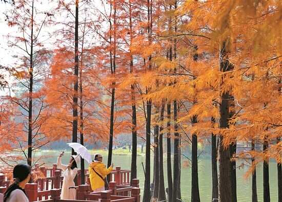 ■黄埔区创业公园,火红的水杉林与清澈的湖面交相辉映,美得就像一幅浓墨重彩的油画。新快报记者 李小萌/摄 |