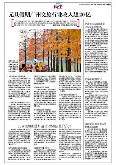 1月2日,记者从广州市文化广电旅游局获悉,元旦假期三天,广州全市接待市民游客272.17万人次,接待外地游客130.66万人次,文旅行业收入超过20亿元。携程、驴妈妈等在线旅游平台数据显示,广州