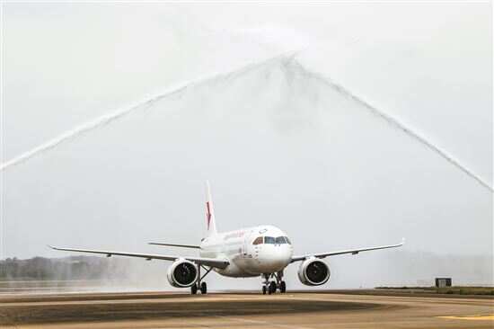 ■1月2日,海口美兰国际机场为国产大飞机C919举行“过水门”仪式。海口是东航C919总计100小时的验证飞行中的一站,标志着其向投入商业运营不断迈进。新华社发