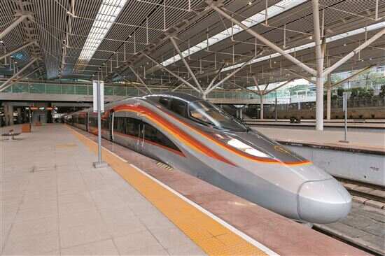 ■4日,复兴号智能型动车组G82次列车7时50分从深圳北站开出,这是广铁集团在粤港澳大湾区首发复兴号智能型动车组,车体呈现“龙凤呈祥”优美外形,5G信号、WIFI实现全车覆盖。通讯员供图