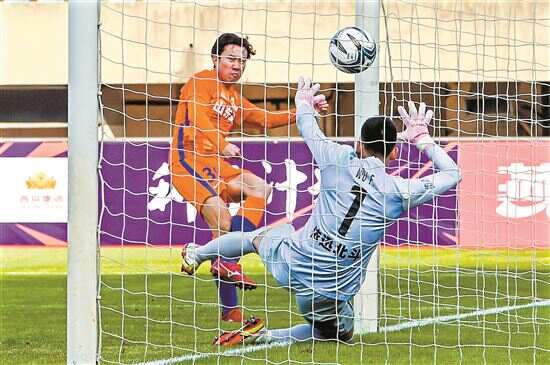 ■1月4日,山东泰山队球员宋龙(左)在比赛中射门得分。 新华社发