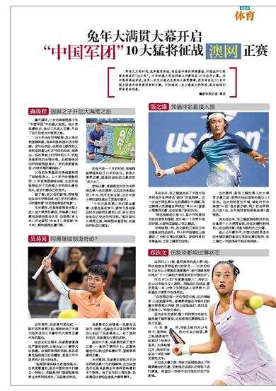 再有几天的时间,兔年就要来临,而在南半球的网球赛场,中国选手已提前为球迷们“过大年”。今年的澳大利亚网球公开赛将在16日拉开大幕。对中国网球迷来说,这是一次足以铭记史册的大满贯赛事,因为有多达1