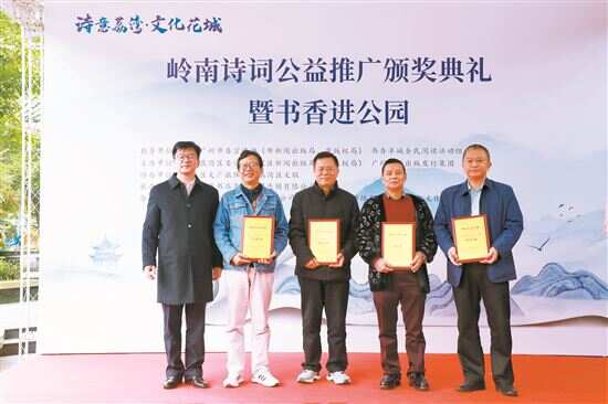 “诗意荔湾 文化花城”岭南诗词公益推广颁奖典礼昨天举行 新快报讯 记者谢源源 通讯员 荔宣报道 1月15日上午,由中共广州市荔湾区委宣传部(区新闻出版局、区版权局)和广州新华出版发行集团主办,“诗意荔湾 文化花城”岭南诗词公益推广颁奖典礼在广州市荔湾区荔湾湖公园举办。 鲜花香飘荔枝湾,在“湾畔花海·I LOVE YOU兔”2023年广州水上花市现场,15日上午,众多文化名家齐聚荔湾湖公园,吟诵唱和,呈现一场文化盛宴。从国风表演、粤语童谣,到红色诗词、古诗词演诵,节目的表演带来一阵又一阵的欢呼。 活动当天,荔湾湖公园“问山书屋”内开展了版权知识有奖竞猜和年度好书“转转转”文化惠民活动,让市民在娱乐体验的同时学习版权知识,培养文化兴趣。后续“问山书屋”还将继续开展丰富多样的书香惠民的文化活动,传递书香。 现场,广东省作家协会主席、暨南大学中文系教授蒋述卓,中国诗歌学会会长、中国作家协会主席团委员杨克等16位个人获得岭南诗词“公益推广大使”荣誉称号。 据介绍,目前,广州正着力推动“诗词之都”建设,荔湾区以“诗词之都”建设为引领,策划举办了一系列的诗词讲座、雅集、读书会、诗书画展览等活动,普及诗词文化,提升公民素质,营造浓厚诗词文化氛围,引领诗词生活新风尚,展现新时代新气象。社会各界的广泛参与让岭南诗词遍地开花,掀起了一股学习诗词、谈论诗词的风潮。 广东省作家协会主席、暨南大学文学院教授蒋述卓表示,广州是有两千年历史文化的城市,是岭南文化重要的传承地和发散地,它完全有建设诗词之都的文化底蕴和文化自信。改革开放和粤港澳大湾区的建设,为广州建成诗词之都提供了更宽广的平台。经过数年的建设,在广州人民的积极参与和共同努力下,诗词之都一定会大放异彩。
